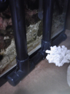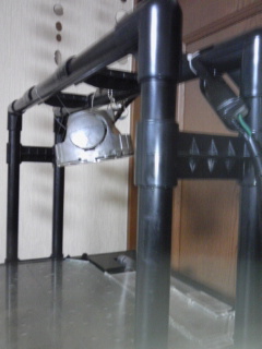 2011.06.15 Wed 01:02:54 自作 メタハラスタンドメタハラスタンドも結構なお値段のするもの。 しかし、単なるメタハラを吊るすハンガー、至って単純なもの、 熱、強度的なものをクリアすれば低予算でメタハラスタンドも自作出来ます。 先輩アクアリストの方々も自作されている方が大勢いらっしゃいますね。 ホームセンターで資材選び、ステンレスパイプやイレクター辺りが王道でしょうか。 アイディア次第では様々にメタハラスタンドを作製出来そうですね。 ただメタハラはかなり熱があるので資材選びには注意が必要そう。 このメタハラスタンドは以前のシステムの時より使用しています。 随分と前に作製、イレクターを使って組み立てました。 パーツを組み合わせるだけで製作できてしまうお手軽度。 イレクターは様々なパーツがあり簡単に好みのスタイルに作製出来ます。 参考までに矢崎化工さんのHP Diy-Life~イレクターでつくろう!!~ 今回は使用していませんが、水槽台にネジで固定出来る パーツもあります。今回、今までの水槽とサイズが違い、 水槽の奥行きが出た為取り付けるスペースがなくなってしまい、 メタハラスタンドは固定せず置いてあるだけです。 ちなみにメタハラはウシオ、UshioSPAX、水槽用ではないと思いますが、 オークションで安定器とセットで格安に購入。 アクアメーカーものよりかなりの低価格で、今の所問題もありません。 球も付属していたのですが、3500K、海水魚、かなり雰囲気に欠ける。 メタハラ球は流石に奮発して、岩崎ハイラックスブルー150Wに交換。 メタハラ交換球は高いですよね。消耗品ですが球切れが恐ろしい・・・ しかしメタハラ、やはり雰囲気は抜群。もちろん生体に対しても良いでしょうし。 10000kとかそれ以上、高いケルビンの数字とうたい文句に 内容どうこうより、ナゼか惹かれて憧れ感を感じる。欲は尽きないものです。 メタハラは適当な針金、ワイヤーなどで留めてあります。 熱があるので拘束バンドでは危険ですよね。 以前は照明のカバー的なものも自作して取り付けていましたが、 スッキリとさせたいので撤去。角度的な事かそれほど眩しくもない。 まさか、まさか、弱ってるの?切れないでねお球さん。 カバー作製には熱のこもりも注意したいところですね。 以前はメタハラ以外にも、安い何処にでもよくあるクリップライトなども 取り付けていました。メタハラ以前も、普通の2灯蛍光灯+クリップライト。 とにかく光を、とにかく明るくと、必死に様々な電球を試し、 電球価格、ワット数からホームセンターでハイワットの工事用? 謎のメーカー電球も付けたりもしていましたが、熱、電力の問題、 ともあれスッキリさせたいので、ここの所メタハラ150W1基。 なんだかんだするより、結局はウチの水槽ではこれで十分。贅沢です。 光は重要ですが、飼育し易い、あまりシビアでない生体を選べば、 配置などで十分対応出来るのでしょうしね。 元々そうではありますが、他に蛍光灯のみで海水魚を飼育されている方も 多数いらっしゃいますからね。 そう、自作絡みで、以前記事で紹介した便利なプラステックダンボール。 これもアイディア次第で様々使えそう、自作素材として◎ こちらのサイトを紹介していなかったので今更ながら紹介。 株式会社ヤマコーさんのHP プラダン.com 水槽関連自作の必需品・接着材 こちらは自作される方にはすっかり定番商品ですね。 「バスコーク」は水槽関連に良く出てくる言葉。もちろん当ブログにも。 超定番商品です。シリコーン系の防水シール。 水槽に使える、補修、自作のマストアイテム。 くれぐれも防カビ剤の入っていないものをご使用下さいね。